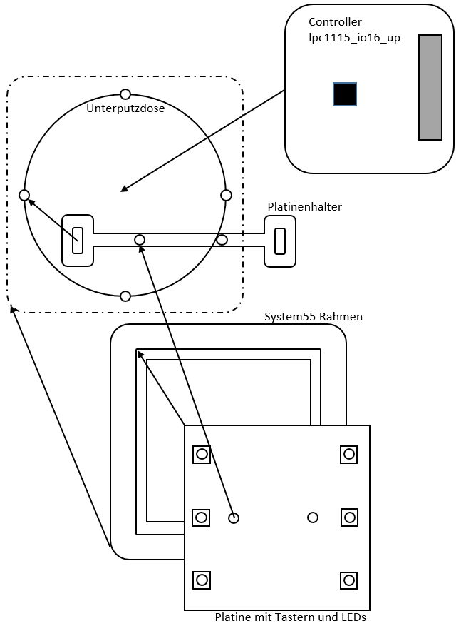 Für diese Aufgabe habe ich einen Haltearm erstellt, der aus Platinenmaterial gefräst wird. Dieser Haltearm wird an die Schraubpunkte der Unterputzdose geschraubt und ist somit auch in den Hohlwanddosen einsetzbar.